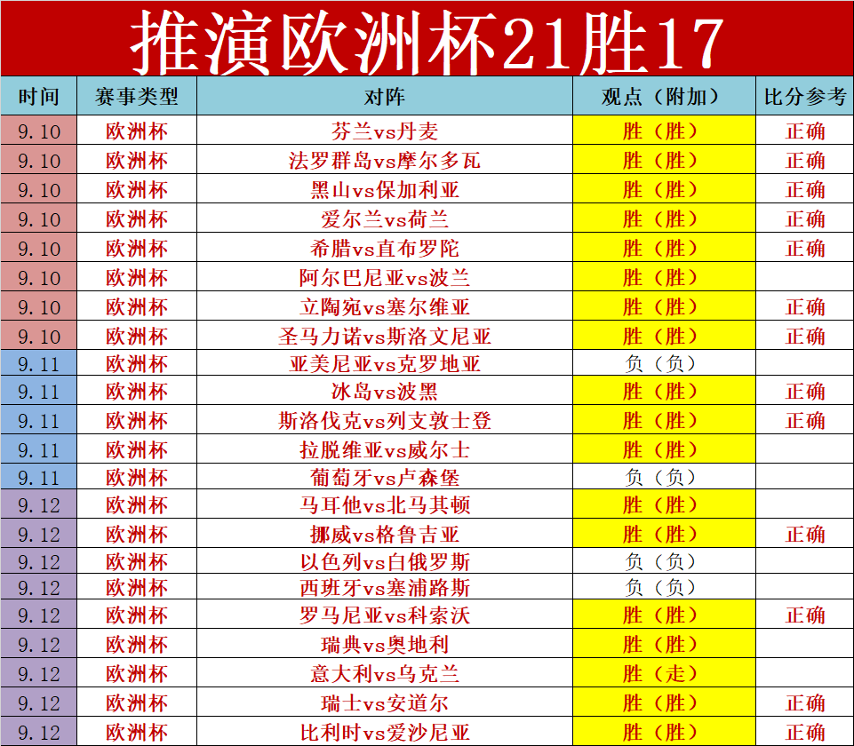 1、推演士计划第95周(走不纳入统计)昨天保持稳定的一天,有2场取胜1场走,昨天击中了2场比分,今天重点欧洲杯来了,欧洲杯近21胜17。