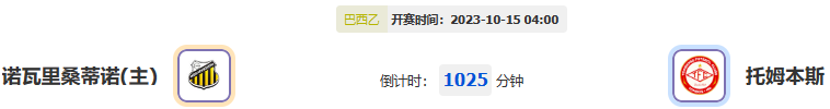 北京时间10月15日04点00分,2023巴西乙联赛第32轮的一场比赛,诺瓦里桑蒂诺将坐阵主场迎来托姆本斯的挑战。托姆本斯本季战绩不佳,目前深陷降级的危机当中,本轮作客排名积分榜前6的诺瓦里桑蒂诺,在往绩交锋方面并不落下风的他们,能否逃过一劫,让小女子为各位小伙伴们一一解答。