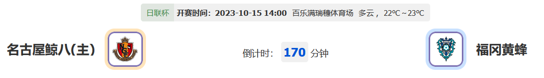 北京时间10月15日14:00,日联杯2023赛季准决赛第二回合比赛,名古屋鲸八vs福冈黄蜂,双方的首轮对决以福冈黄蜂凭借主场优势率先拿下一场胜利,此番主客互易之下名古屋能否在主场扭转劣势?客队是选择坚守主场还是主动出击?让我们一起关注!
