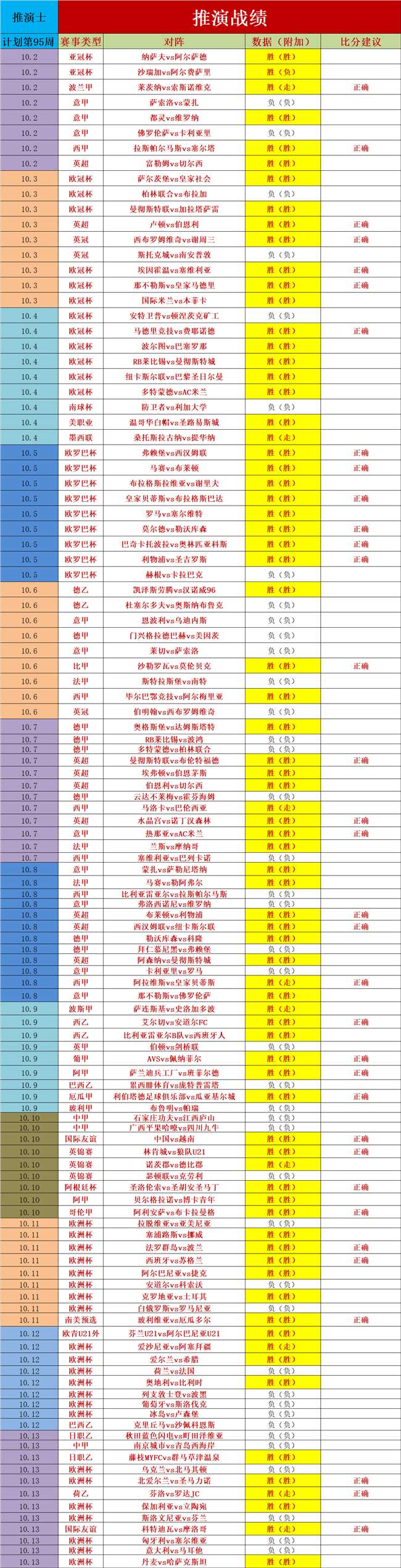 1、推演士计划第95周(走不纳入统计)昨天保持稳定,值得称赞的是,击中了3场比分,今天乘胜追击,今天重点赛事继续。