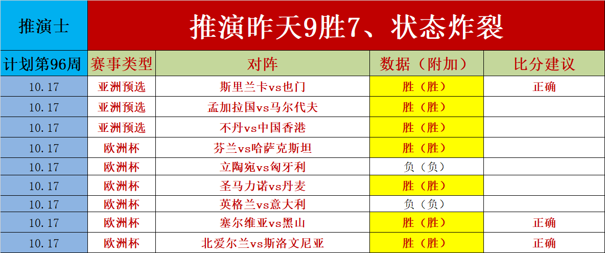 1、推演士计划第96周(走不纳入统计)昨天状态超级炸裂,拿下9胜7的佳绩,并且击中了3场比分,一切尽在掌握之中中,今天的主要以小联赛为主,敬请期待。