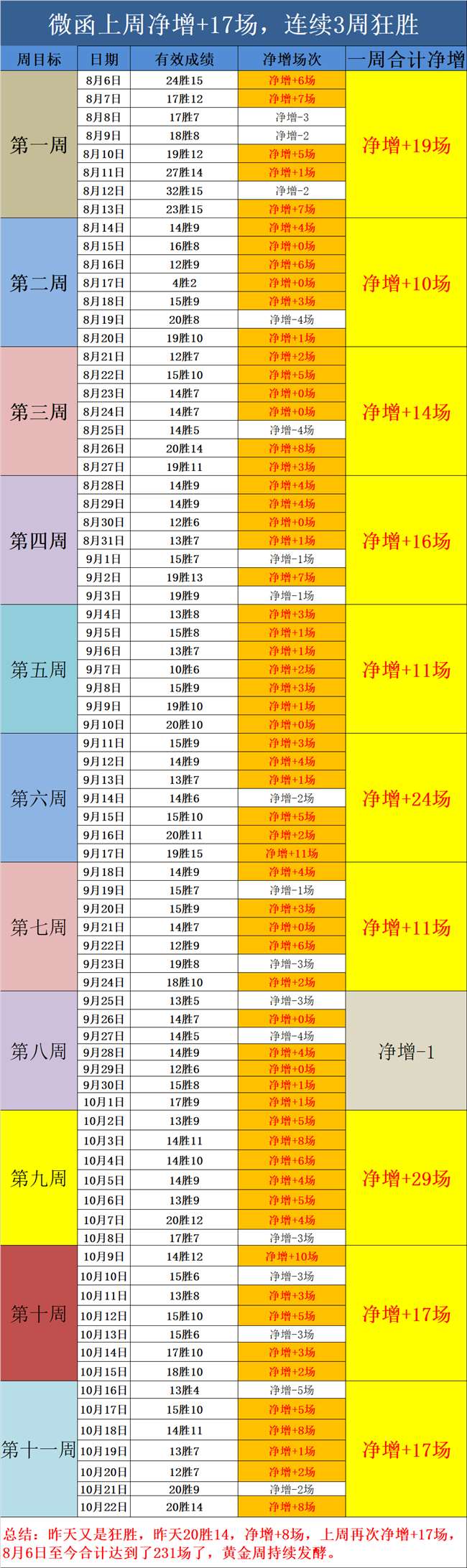 精彩分享:昨天又是狂胜的一天,昨天20胜14,净增+8场,上周一共净增+17场,再次完成周净增长的目标,连续3周狂胜,3周合计净增高达63场,平均下来计算,这3周内每天净增+3场,截止目前,从8月6日至今,合计已经突破了231场,这个数字还在继续增加,向净增+300的大关冲刺,稳定的状态已经持续了多月。