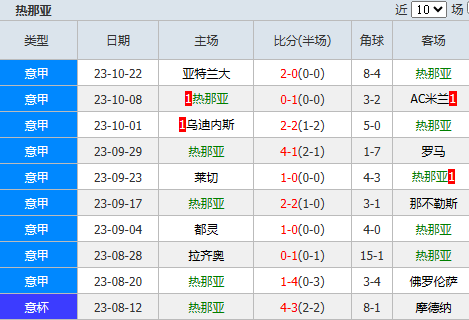 2、两队过往有过11次交锋记录,热那亚4胜3平4负,两支球队可谓势均力敌。