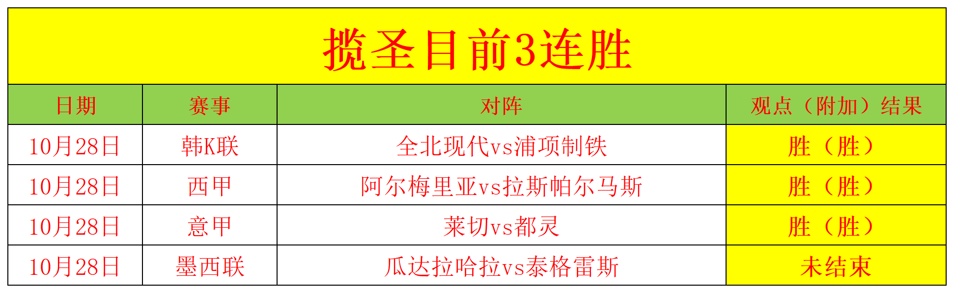 揽圣10月4日至10月9日豪取18连胜。昨天4场比赛已经拿下了3场,剩下一场墨西联未结束,目前又是3连胜的佳绩,笔者状态再次飙升,今天我们再接再厉。足球比赛是追求长期的稳定,长期的关注才能得益,一时的下滑并不意味着失败,大家不要因为一时的下滑而放弃关注,笔者会努力挖掘更精准的赛事分享给大家,感谢大家的支持。