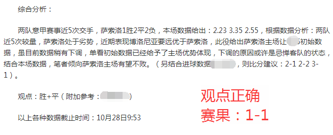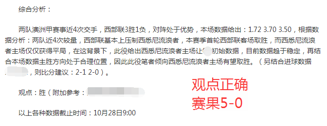 昨日4场无一失利,澳超赛事,西悉尼流浪者主场5球完美大胜西部联,观点符合笔者预期;德乙赛事:沙尔克04主场3-2力克汉诺威96,进球数符合笔者预期;意甲赛事:萨索洛主场1-1战平博洛尼亚,观点符合笔者预期;西甲赛事:马洛卡主场0-0战平赫塔菲,比分方向完美打出。