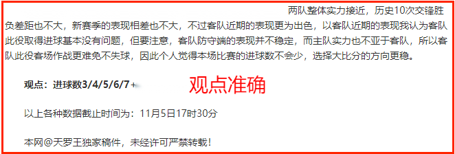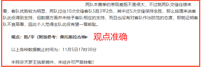 (温馨提示:观点回顾为已完场赛事的统计,并不能代表未来的观点预测结果走势,观点仅为其个人意见,与平.台无关。资讯仅供体育爱好者浏览,并不构成购.彩建议,任何人不得用于非法用途,请广大用户理性消费。)