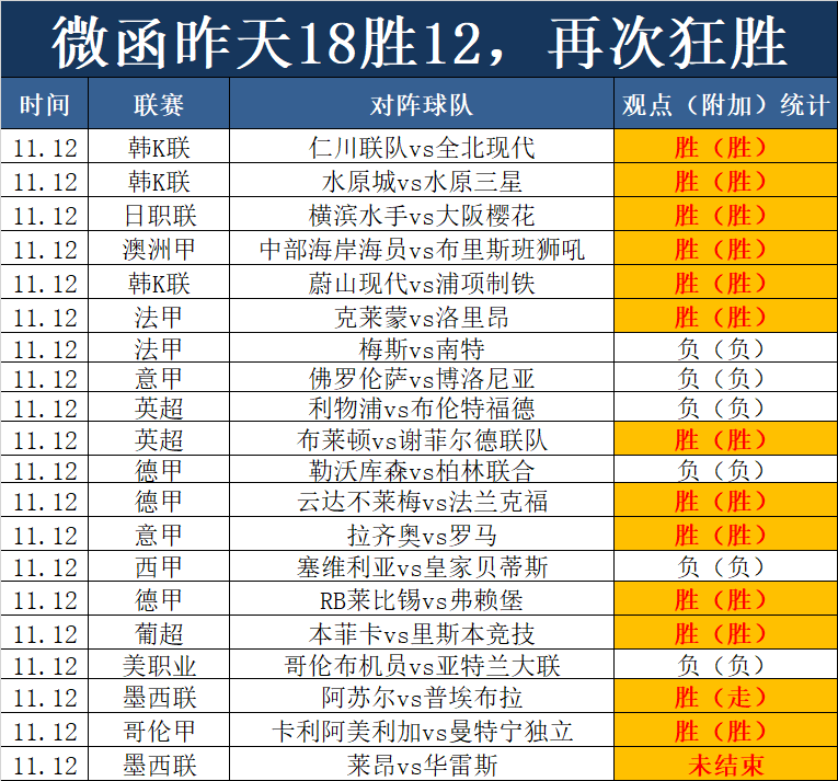 1、昨天再次狂胜,取下18胜12的成绩,昨天的早场表现惊艳,亚系5场大获全胜,上周再次完成净增目标,已经连续6周狂胜,连续6周完成净增目标,早上还有1场墨西联正在进行,目前形势不错,打出的问题不大。
