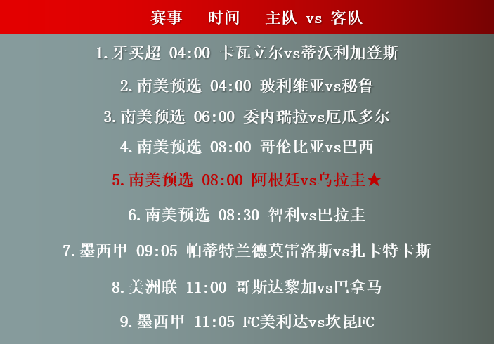 赛事前瞻:本文提供11月17日04时00分-11时05分时段的9场足球赛事走势分析表,当中包括牙买超、南美预选、墨西甲、美洲联等赛事提供分析参考,具备较高的参考价值。主要关注赛程如下: