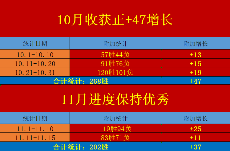 昨天已完成赛程收获13场胜利观点分享,月度日赛程仍然处于稳定净值增长进度。11月至今已达成202场胜利观点分享并从中转化出净+37的优质正向增长成绩,延续10月精彩进程,连续5旬保持着坚实的稳定数据表现,新版模块持续交出精彩的优势成绩,极高的数据亲和力表现值得信任!