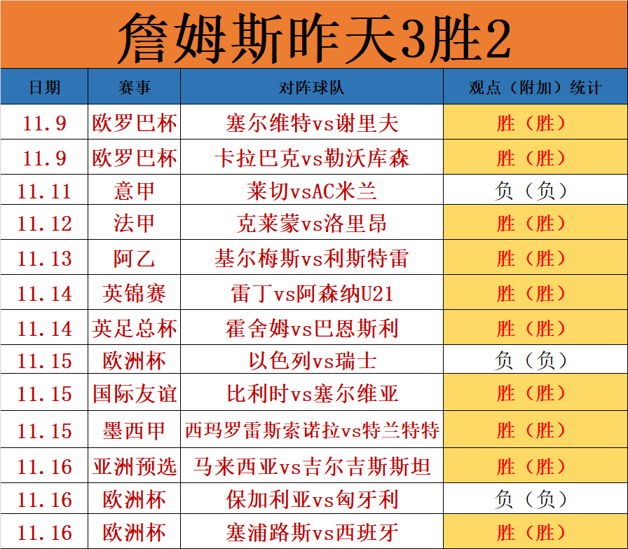 二、战绩回顾:昨天再次打出了3胜2的成绩,持续保持高效的成绩,今天五星建议3场继续。