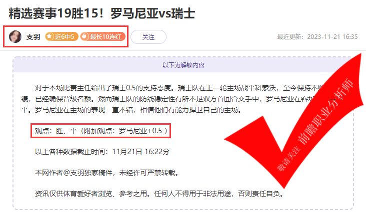 温馨提示:观点回顾为已完场赛事的统计,并不能代表未来的观点预测结果走势,观点仅为其个人意见,与平.台无关。资讯仅供体育爱好者浏览,并不构成购.彩建议,任何人不得用于非法用途,请广大用户理性消费。