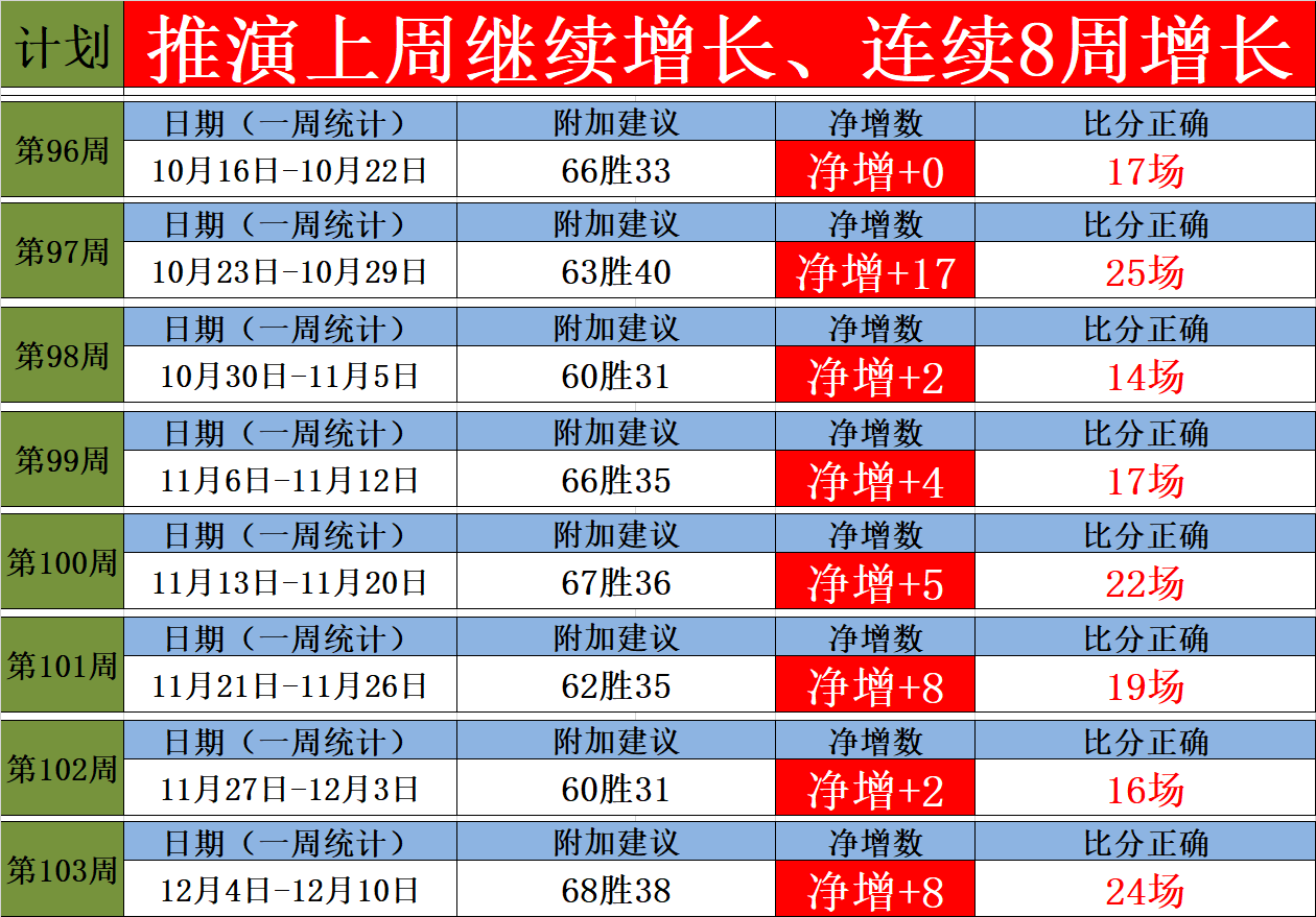 注:观察到了大家选择性的关注,这是不理性,按照推演每周的计划,必定有增长,成绩有目共睹,切记不能因为一天半天小偏差,就放弃了,另外要提醒的是,每场比赛的建议,要均数,不能增数,这样的话,一周下来必定会有增长的,笔者的计划是一周的。