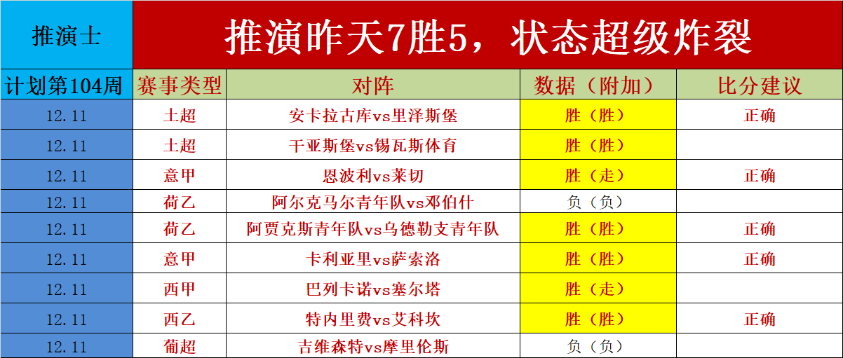 1、推演士计划第104(走不纳入统计)昨天周一就开始炸裂,昨天拿下7胜5的佳绩,9场比赛仅仅只有2场失手,而且昨天击中了5场比分,昨天的含金量十足,今天重点欧冠杯来了。