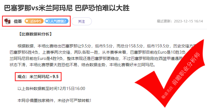 《对主流赛事都有独特的见解和分析,擅于统计分析统计球队战绩和球员的状态》