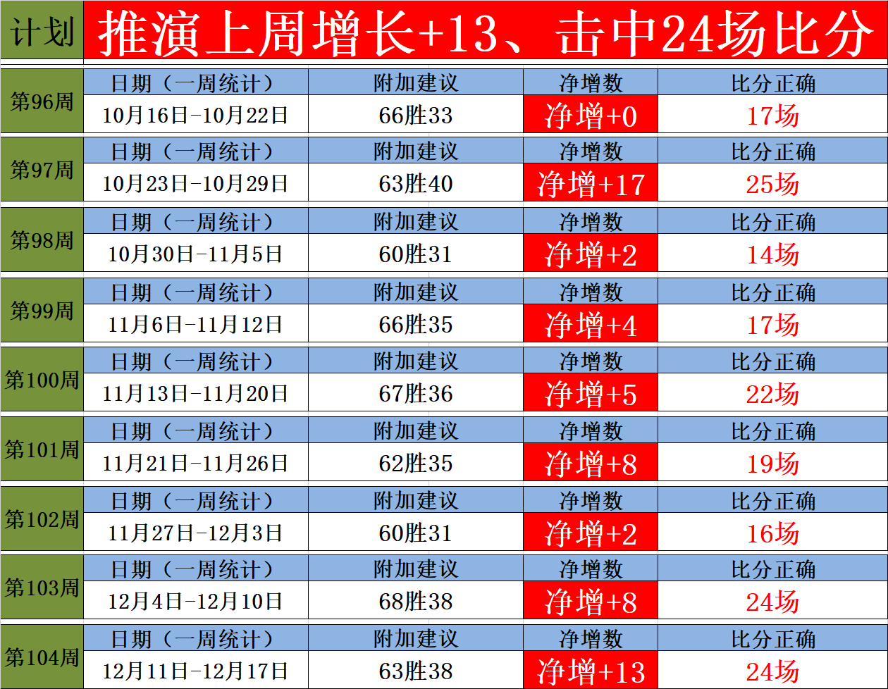 1、推演士计划第104完美收官(走不纳入统计)上周状态炸裂,拿下净增+13场的佳绩,并且击中了24场比分,已经连续9周净增长了,上周老铁们尝到不小的甜头了,新的一周继续冲刺。
