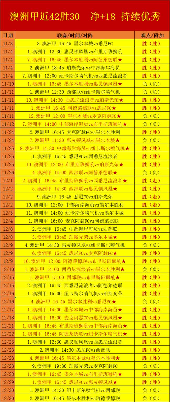 澳洲甲赛程连续2个月时间交出优秀的精彩数据发挥,交出的42场比赛拿下30场胜利观点分享,取得净+18的优质正向收获,本日继续携手优质赛事领衔首个板块的数据组合,争取以优势成绩起步并迈向精彩的胜利收官!