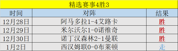 昨天的精选赛事平稳过渡,西汉姆联0-0布莱顿,精选赛事4场无败绩。今天继续努力,争取更好成绩。