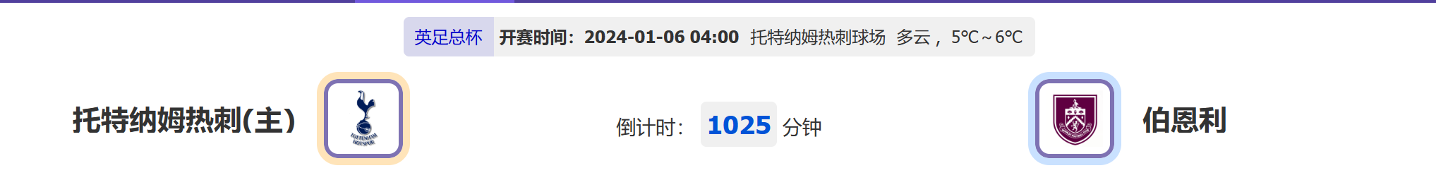 北京时间01月06日04:00,2023-2024 英格兰足总杯赛,托特纳姆热刺vs伯恩利,两队在英超赛场上排名有所差距,今天在杯赛上相遇会有怎样态度呢?