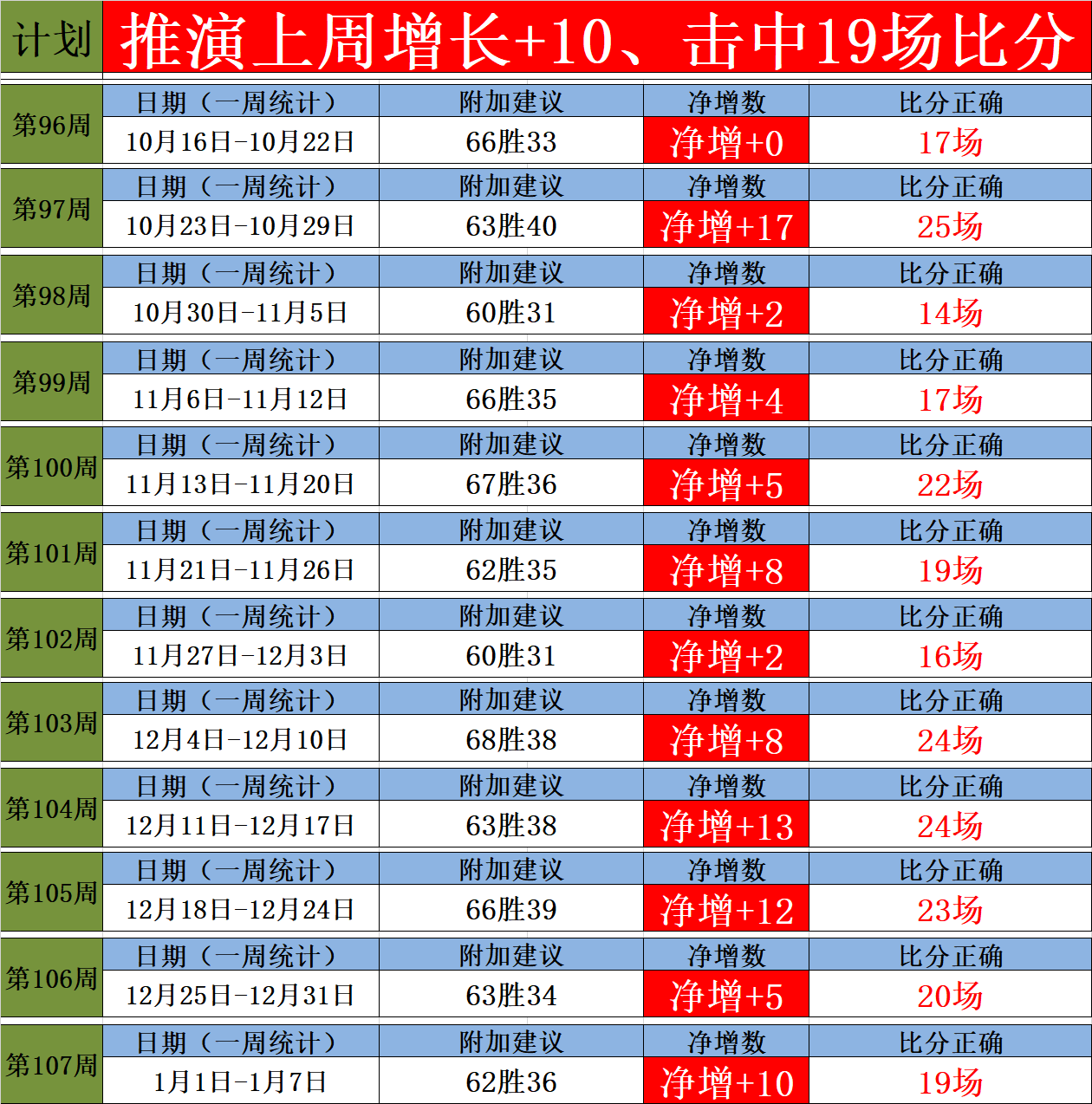 1、推演士计划第107周完美收官(走不纳入统计)昨天状态超级炸裂,拿下12胜8的佳绩,并且击中了4场比分,昨天战绩含金量依然非常高,四天共击中了16场比分,值得称赞的是,昨天的澳甲继续获胜,澳甲已经4连胜,今天继续乘胜追击。
