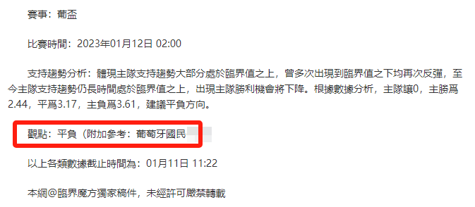 溫馨提示:觀點回顧為已完場賽事的統計,並不能代表未來的觀點預測結果走勢,觀點僅為其個人意見,與本網站無關。資訊僅供體育愛好者瀏覽,並不構成購.彩建議,任何人不得用於非法用途,請廣大用戶理性消費。