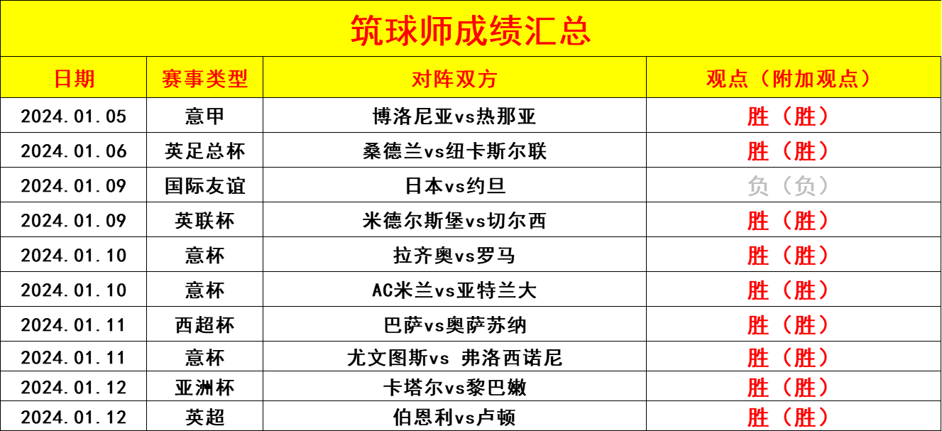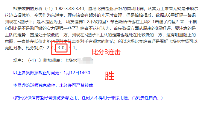 连续三天大获全胜,7连胜,杯赛也迎来了连胜,近10胜9;昨天送出两场比赛,一场亚.洲杯的比赛,一场是英超的比赛,两场比赛不仅附加观点顺利拿下,两场比赛的比分也又被笔者侥幸猜中;近期状态相当火热,恭喜相信筑球师的朋友们;杯赛比联赛更加容易出错,是因为杯赛有很大的不稳定性以及战意的加持,所以必须要透过本质看比赛,并且要认清数据走势的真伪;笔者今天继续会秉承宁缺毋滥的精神,只推有质量有信心的比赛而不是数量搭够,确保每一场比赛都有胜率的;今天笔者同样挑选出信心场次,希望大伙们可以一起与筑球师研究胜利的观点。