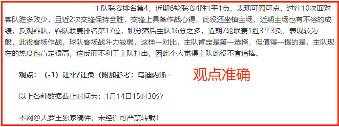 (温馨提示:观点回顾为已完场赛事的统计,并不能代表未来的观点预测结果走势,观点仅为其个人意见,与平.台无关。资讯仅供体育爱好者浏览,并不构成购.彩建议,任何人不得用于非法用途,请广大用户理性消费。)