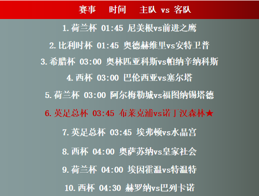 赛事前瞻:本文提供01月18日01时45分-04时30分时段的10场足球赛事走势分析表,当中包括荷兰杯、西杯、英足总杯、比利时杯等赛事提供分析参考,具备较高的参考价值。主要关注赛程如下: