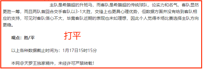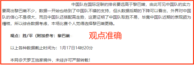 (温馨提示:观点回顾为已完场赛事的统计,并不能代表未来的观点预测结果走势,观点仅为其个人意见,与平.台无关。资讯仅供体育爱好者浏览,并不构成购.彩建议,任何人不得用于非法用途,请广大用户理性消费。)