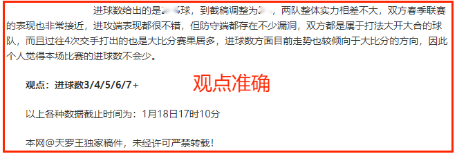 (温馨提示:观点回顾为已完场赛事的统计,并不能代表未来的观点预测结果走势,观点仅为其个人意见,与平.台无关。资讯仅供体育爱好者浏览,并不构成购.彩建议,任何人不得用于非法用途,请广大用户理性消费。)