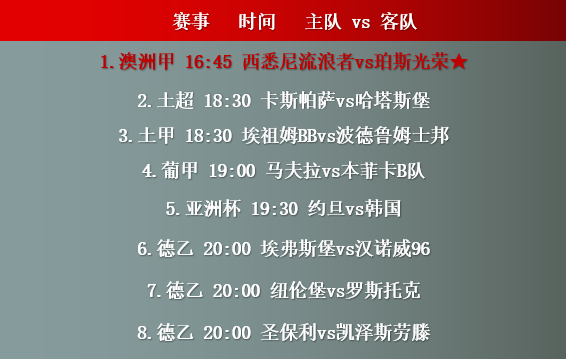 赛事前瞻:本文提供01月20日14时30分-20时00分时段的8场足球赛事走势分析表,当中包括澳洲甲、土超、葡甲、德乙等赛事提供分析参考,具备较高的参考价值。主要关注赛程如下: