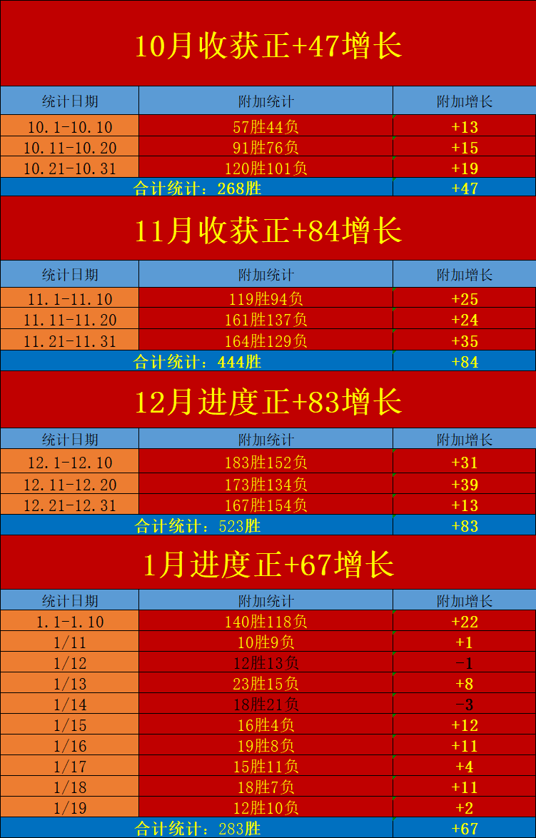 周中保持优秀成绩进度,连续5天拿下优秀正向成绩,昨日已完成赛程拿下12场胜利观点,暂时收获净+2增长,本周已完成的5天赛程合计拿下80场胜利,增长狂+净40正向,中旬进度积累远超过去三个月的同期表现。1月赛程进度合计取得283场胜利观点并从中转化出优质的+67场精彩正向,笔者的第11个优秀增长旬计划已经成功奠定,本日是1月中旬计划的收官日,争取继续交出优秀成绩单,在原有的净增基础上向更高的进程峰值发起冲击!