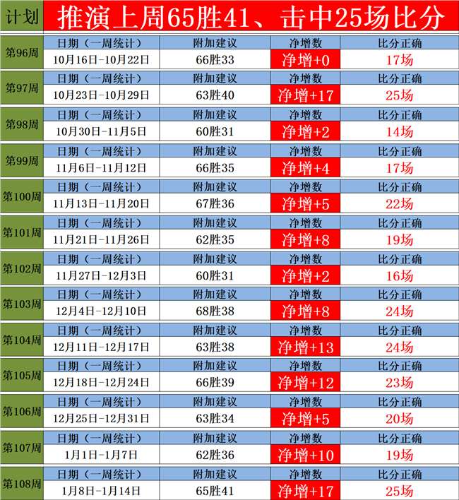 2、上周65胜41,净增长+17,近51有47周保持正向净增长,上周预测25场比分正确,持续的保持了高效的稳定,连续13周正向增长。