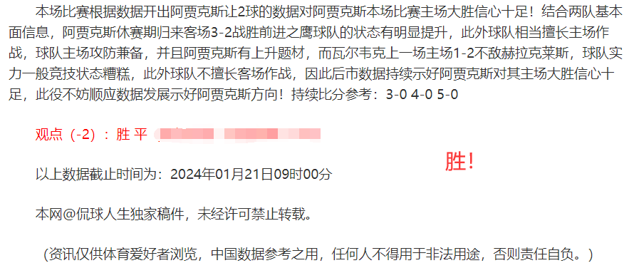 (温馨提示:观点回顾为已完场赛事的统计,并不能代表未来的观点预测结果走势,观点仅为其个人意见,与平.台无关。资讯仅供体育爱好者浏览,并不构成购.彩建议,任何人不得用于非法用途,请广大用户理性消费。)