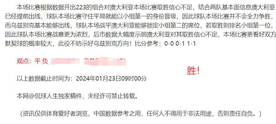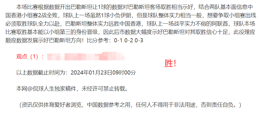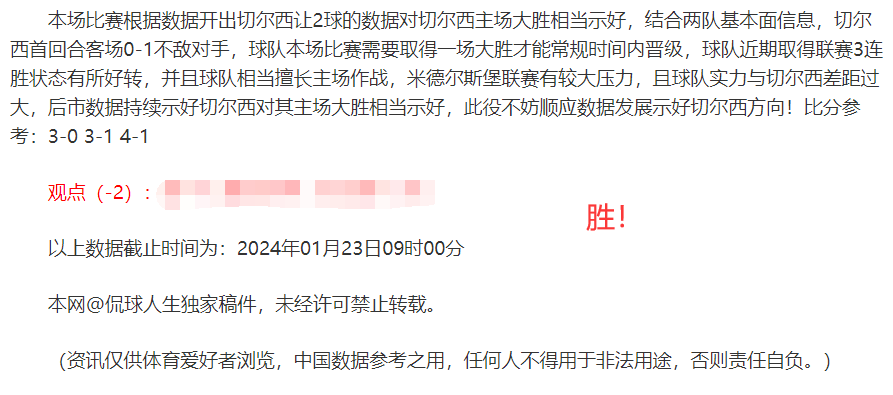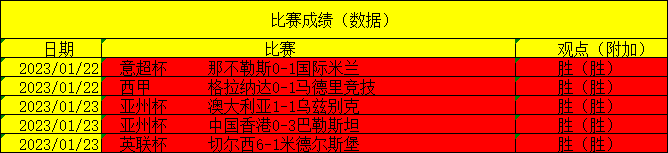 (温馨提示:观点回顾为已完场赛事的统计,并不能代表未来的观点预测结果走势,观点仅为其个人意见,与平.台无关。资讯仅供体育爱好者浏览,并不构成购.彩建议,任何人不得用于非法用途,请广大用户理性消费。)