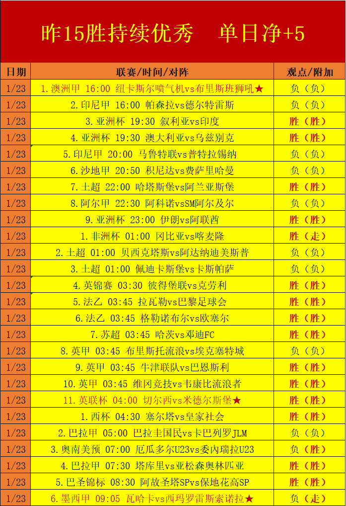 昨天数据表现低开高走,已完成赛程拿下15场胜利观点,单日取得净+5的优质正向成绩,保持全面追踪的动作才是拿下优质正向的关键要点!1月下旬进度开始发力,截至到目前为止,1月已完成赛程拿下354场胜利观点并从中转化出净+80场的优质正向,笔者的第12个优秀旬计划正式起航,本日继续精选主流焦点赛程整合,1月赛程迈向更高峰值突破!