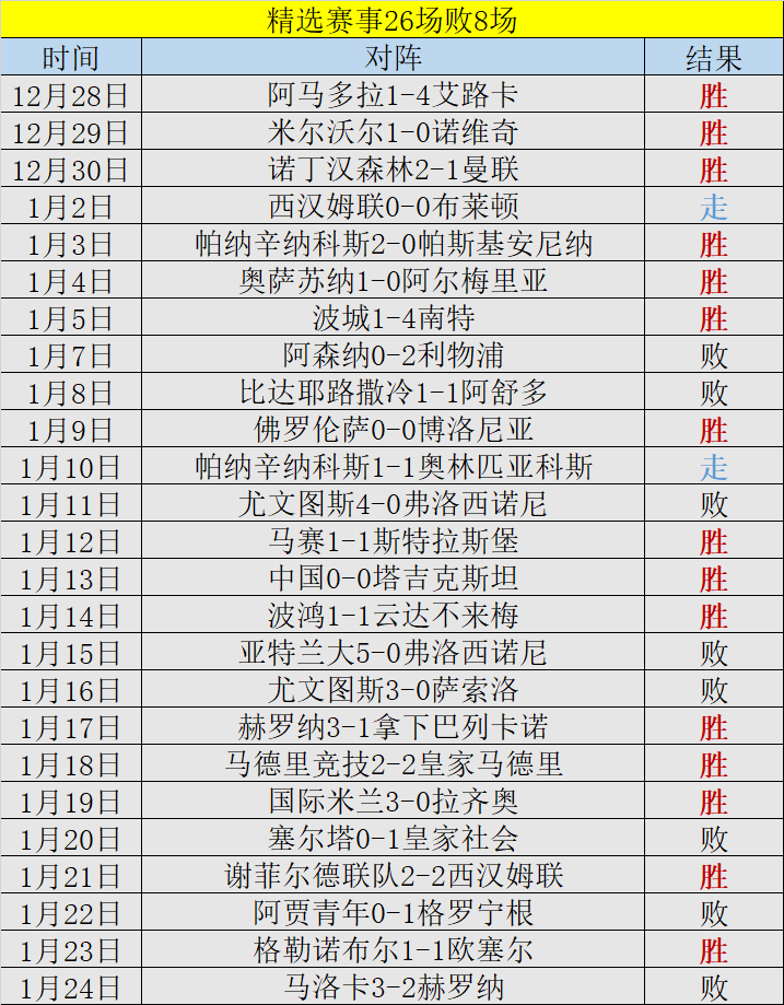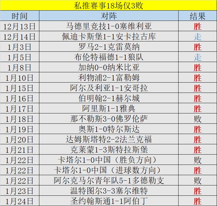 昨天私推赛事继续胜利,18场仅3败,状态炸裂。至于精选赛事则未能取胜,精选赛事26场败8场,成绩还是很不错的。
