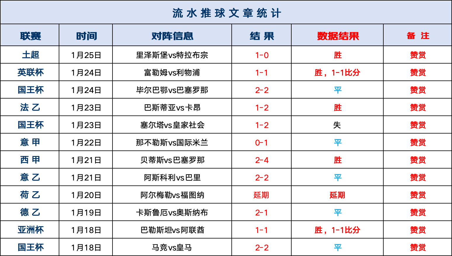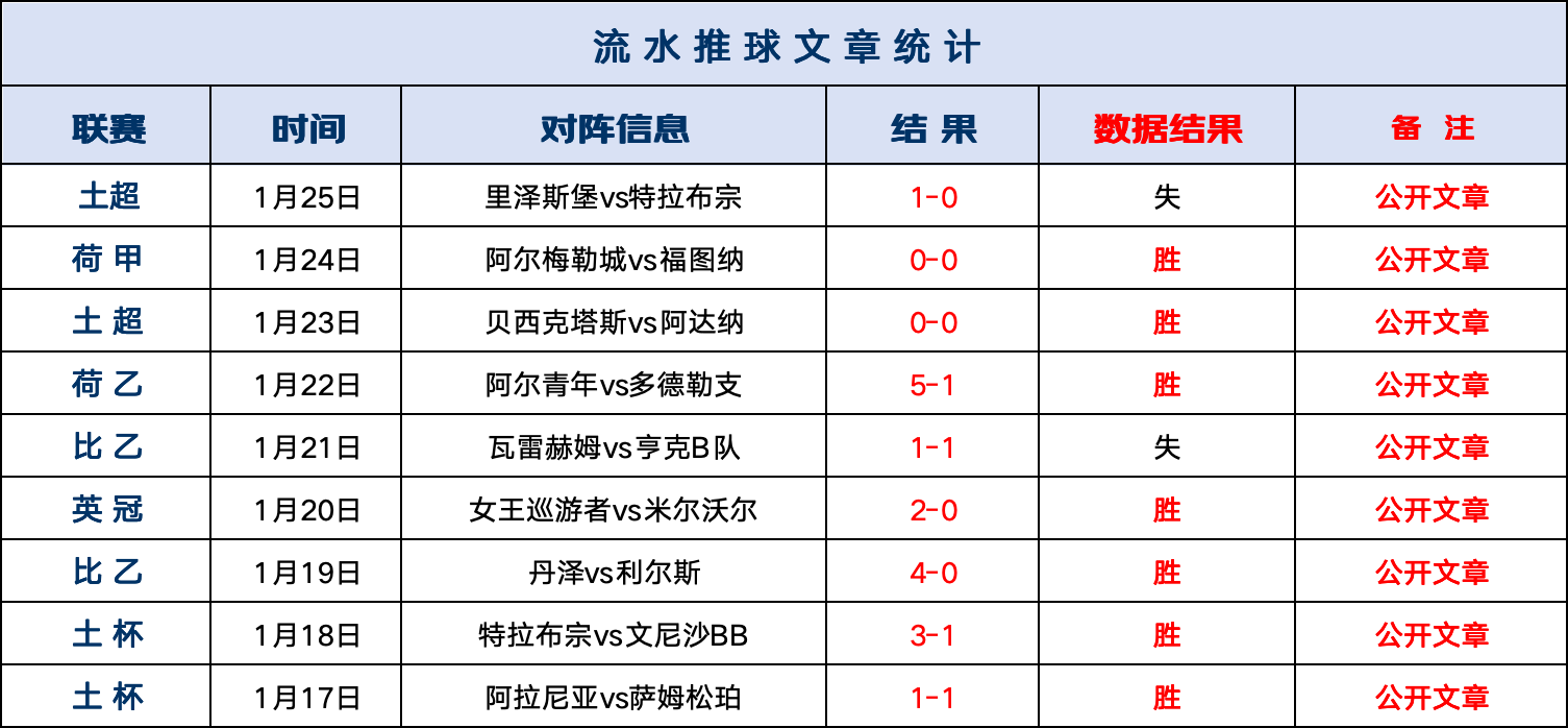 赞赏回顾:流水赞赏连战连捷,里泽斯堡1-0特拉布宗,方向跑出。流水赞赏曾连续6周周榜第一,更是有156天总体正确率近7成(不含走)的长期稳定发挥,今天继续一起采摘果实!!!