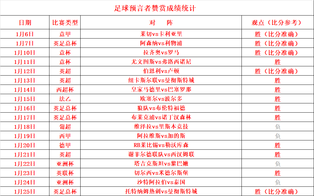 虽然前天送出的亚.洲杯没有取胜,但昨天送出一场英足总的比赛:托特纳姆热刺vs曼彻斯特城,送出客队方向,带领大家重回胜轨,不仅方向选择正确,就连比分也是准确拿捏的;大家也不要因为一点起伏而放弃关注,长期稳定的发挥才是大家想要结果;18场只失4场,这个成绩还是值得大家信任的;不想错过预言者每一场比赛,包周会是一个更合适的选择。