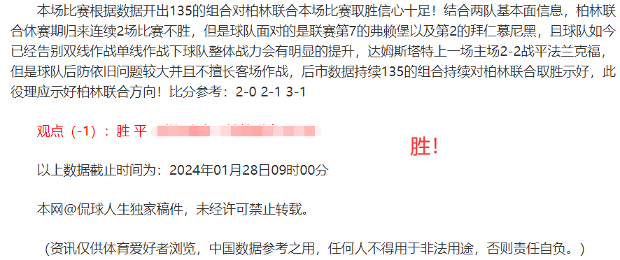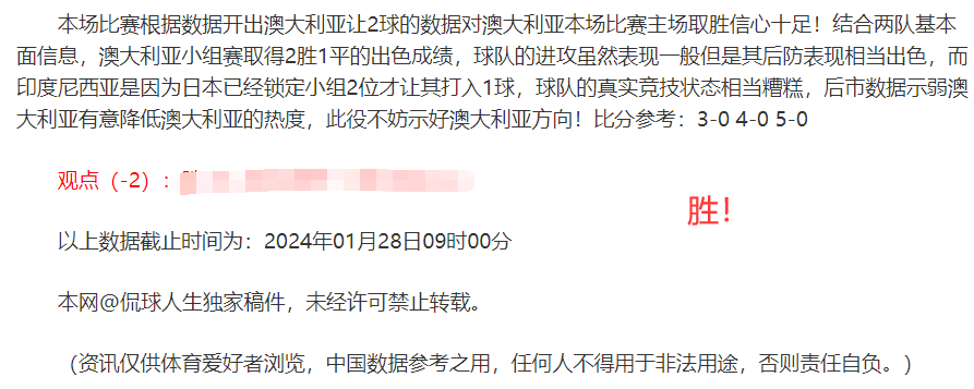 (温馨提示:观点回顾为已完场赛事的统计,并不能代表未来的观点预测结果走势,观点仅为其个人意见,与平.台无关。资讯仅供体育爱好者浏览,并不构成购.彩建议,任何人不得用于非法用途,请广大用户理性消费。)