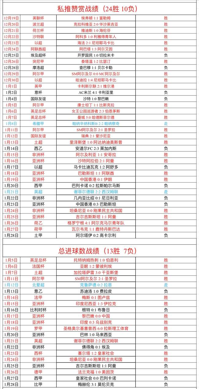 周日私推结果不佳,判断出现了明显的问题,有些想当然了,太注重数据了,应该需要更加全面的以基本面为准!私推赞赏4连胜被终结了,拿到24胜10负,状态不俗!解锁文章没能开启连胜势头!私推总进球数拿到13胜7负,还需努力!