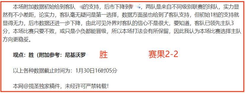 (温馨提示:观点回顾为已完场赛事的统计,并不能代表未来的观点预测结果走势,观点仅为其个人意见,与平.台无关。资讯仅供体育爱好者浏览,并不构成购.彩建议,任何人不得用于非法用途,请广大用户理性消费。)