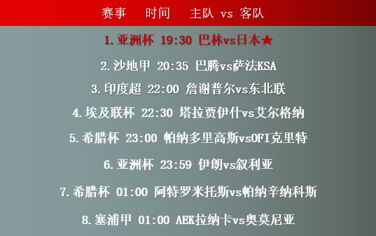 赛事前瞻:本文提供01月31日19时30分-次日01时00分时段的8场足球赛事走势分析表,当中包括亚杯、沙地甲、希腊杯、印度超等赛事提供分析参考,具备较高的参考价值。主要关注赛程如下:
