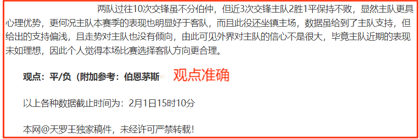 (温馨提示:观点回顾为已完场赛事的统计,并不能代表未来的观点预测结果走势,观点仅为其个人意见,与平.台无关。资讯仅供体育爱好者浏览,并不构成购.彩建议,任何人不得用于非法用途,请广大用户理性消费。)