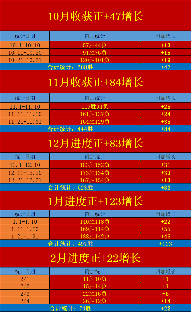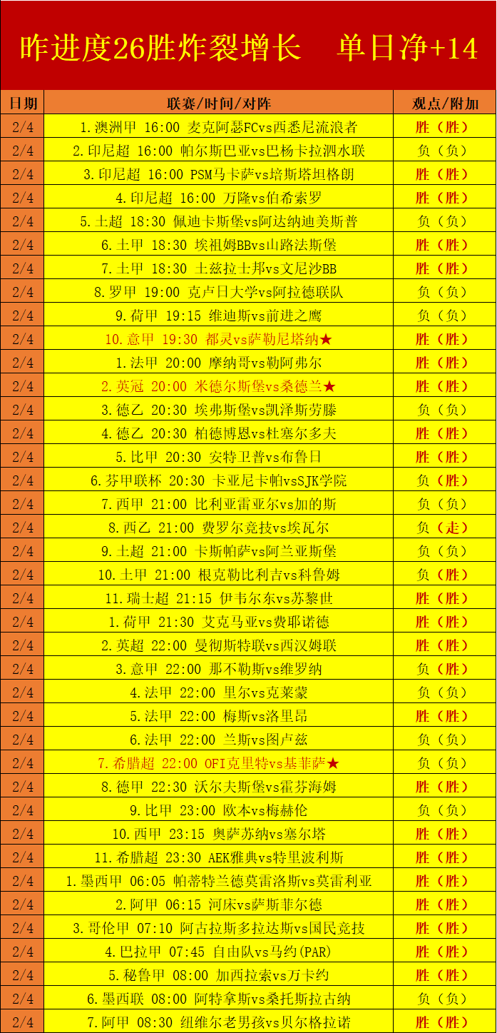 昨天已完成的4个数据板块继续交出精彩的数据击中能力,拿下26场胜利观点方向,携手周末的收官赛程,拿下优质的净+14正向增长!2月上旬状态连续飙升,连胜4天拿下74场胜利观点分享并成功转化出净+22的优质净增成绩!本日赛程是2月上旬计划的中点,上旬计划的优秀基础已经生成,在过去的4个月时间里,笔者合计拿下了12个连胜的旬计划增长,继续精选值得关注的焦点赛程组合进行优秀的旬计划冲刺!