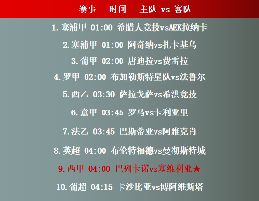 赛事前瞻:本文提供02月06日01时00分-04时15分时段的10场足球赛事走势分析表,当中包括塞浦甲、意甲、英超、西甲等赛事提供分析参考,具备较高的参考价值。主要关注赛程如下: