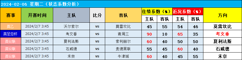 通过对两队的历史成绩、交手成绩及升降级等得出往绩系数;而近况系数则是通过近期(10场左右)成绩分析通过公式计算得出近况系数。