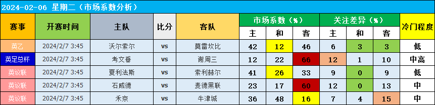 注:市场数据与关注差异均有出现深色标记的选项为大概率出现冷门!