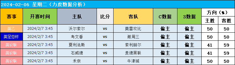 大数据栏目:本栏目将当天的赛事列出经由大数据分析得出的任何高概率选项供网友参考(期间若连续2天总胜率低于50%,将免费1期补偿)。现时大数据分析逐渐融入我们的生活当中,任何一个动作都能参照历史数据得出下一个行为是什么。足球作为一项竞技体育赛事,自然也离不开大数据的分析,在可供查找的数据中我们可以经过特殊的算法得出赛事的某些选项高频概率,而本栏目正是因此而创建。