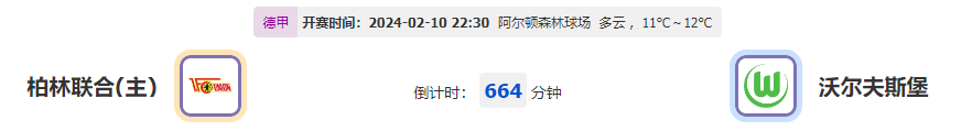 北京时间2024年02月10日22:30,此役是柏林联合与沃尔夫斯堡今年的第一场对决,柏林联合取胜表现无法回升,此役能否拿下胜绩捍卫主场?而沃尔夫斯堡延续此前皮辊用的状态,此番客访定然不失抢分战意,他们又能否做到去全身而退?