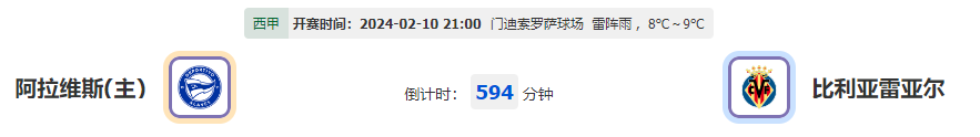 北京时间02月10日21:00,西甲第24轮,阿拉维斯vs比利亚雷亚尔。阿拉维斯联赛表现出色,如今还是在中游持续上升,他们能否在此役得到反弹?比利亚雷亚尔表现却显低迷,当下下滑明显,此役作战谁是更有作为的一方?
